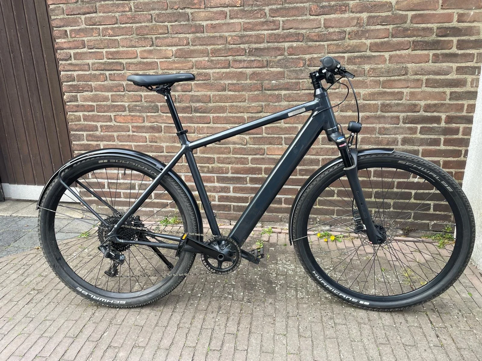 Ausgestattet ist das Bike mit einer klassischen Kettenschaltung (SRAM NX, 11-fach), hydraulischen Scheibenbremsen, komfortabler Suntour Federgabel (63 mm) sowie kompletter StVZO-Ausstattung inklusive integrierter Beleuchtung.